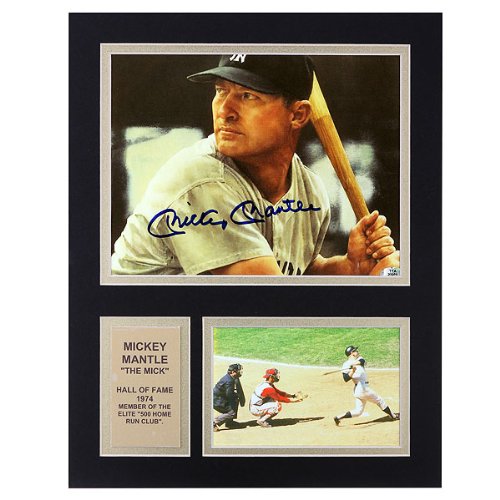 This highly collectible dual set of photos show the legendary Mickey Mantle in live shots at bat. His famously powerful swing, right or left, made him the feared & greatest switch hitter of all time. Two pictures here show Mantle, the top picture is the glare of focus as he awaited the next pitch and the bottom picture shows the picture perfect finish of a violent swing.. This great set of photos is double matted in black and gold, complimenting the color photos beautifully. The 7x9" photo is autographed , and certification hologram is in right hand lower corner. Own a piece of baseball history with this collectible duo of fabulous photos, complete with Mantle's highly collectible autograph. The name plate at the bottom denotes the year he was inducted in to the Hall of Fame and his achievement of being a member of the elite 500 Home Run club. He is regarded by many to be the greatest switch hitter of all time, and one of the greatest players in baseball history.